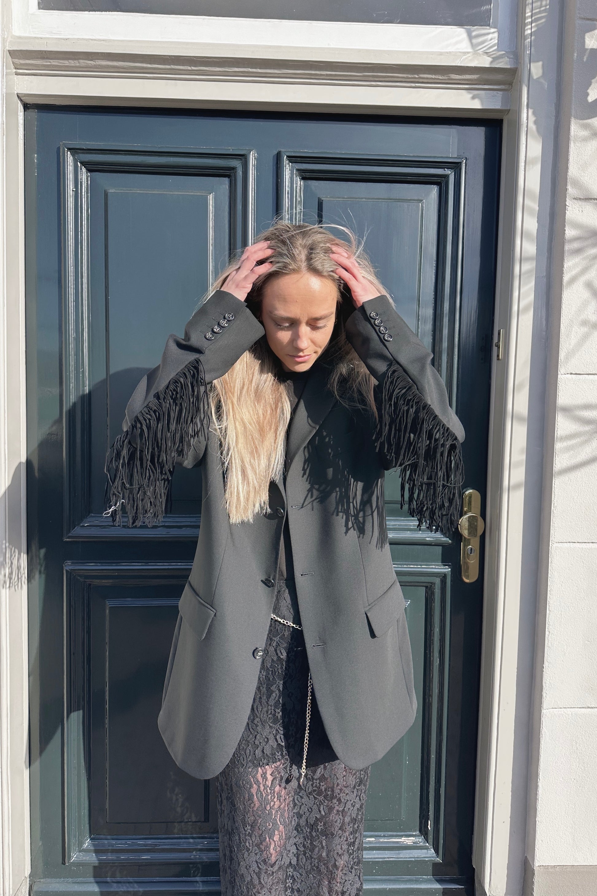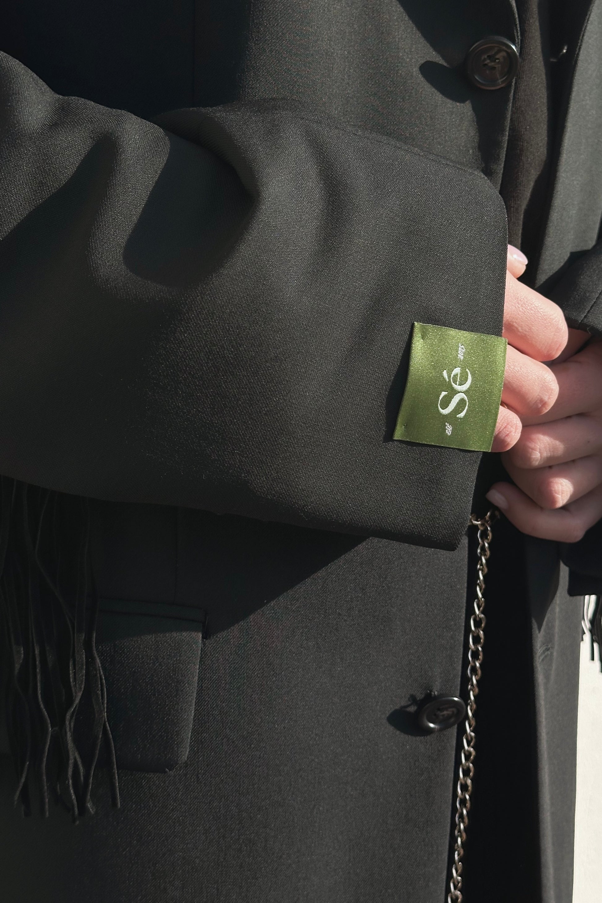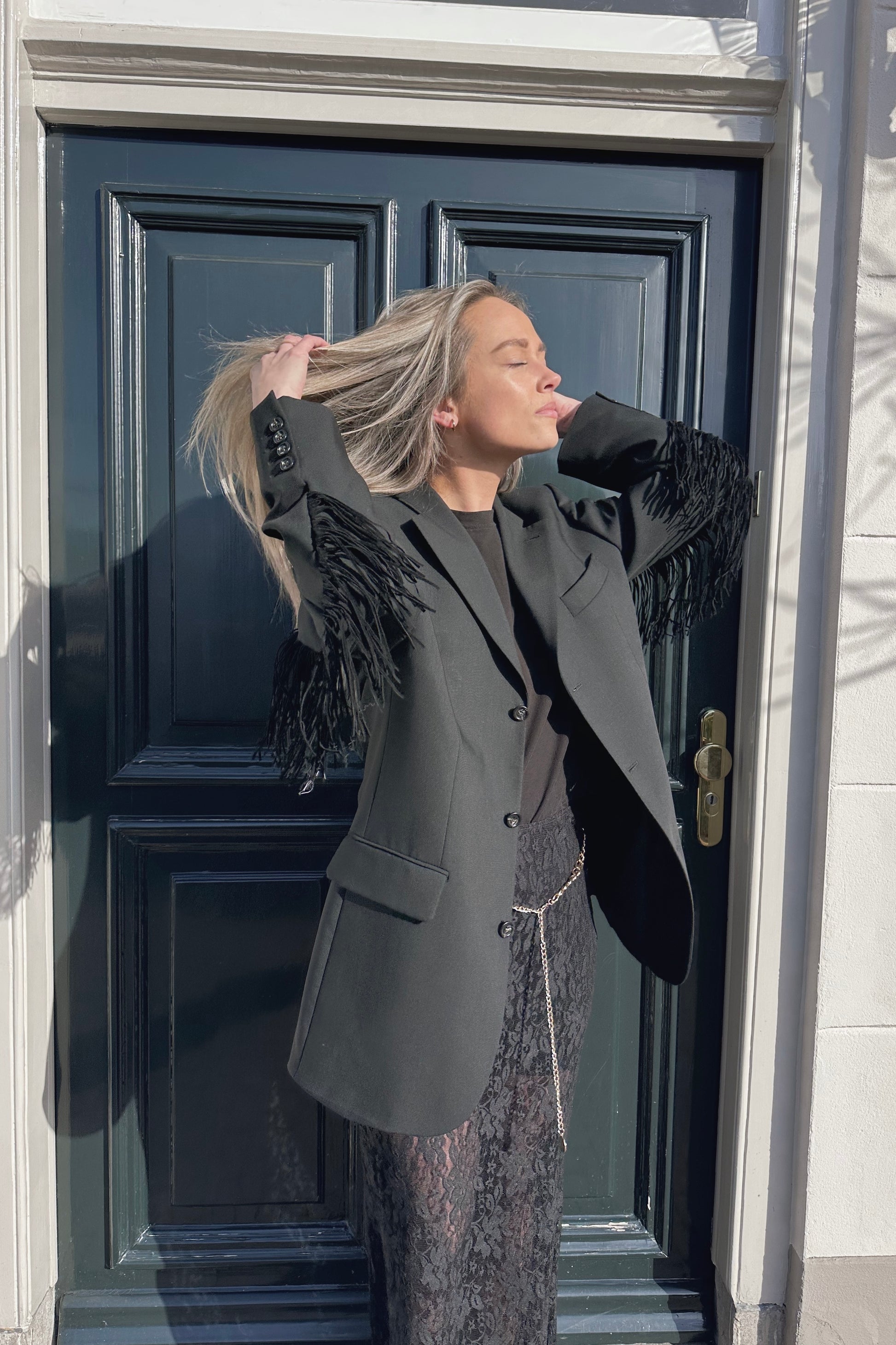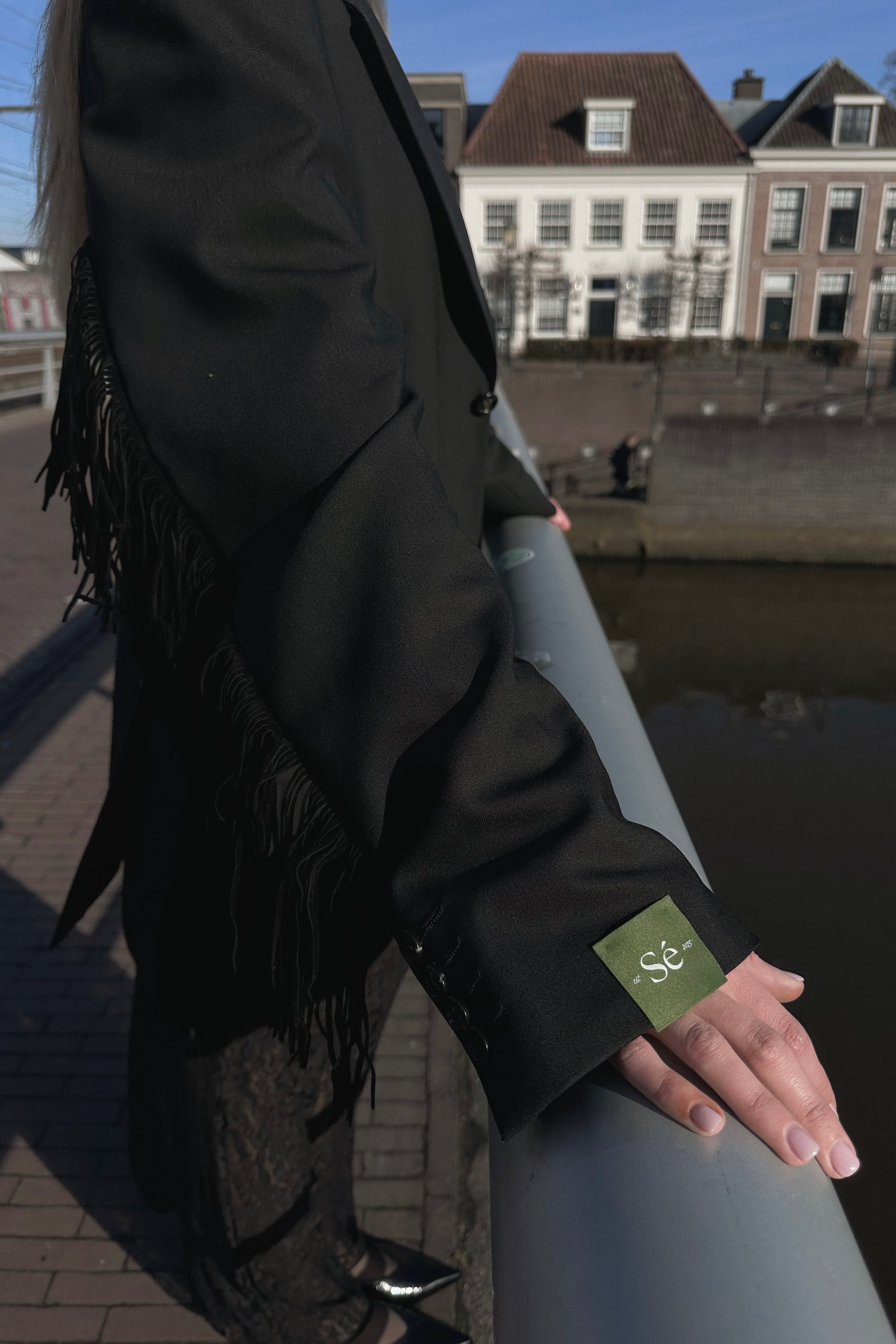 A timeless black vintage blazer reimagined with flowing fringe details along both sleeves. The classic tailored silhouette is contrasted by soft movement, creating a piece that feels powerful yet effortless. Designed to catch the light with every step, the fringe adds subtle drama without losing its refined elegance.