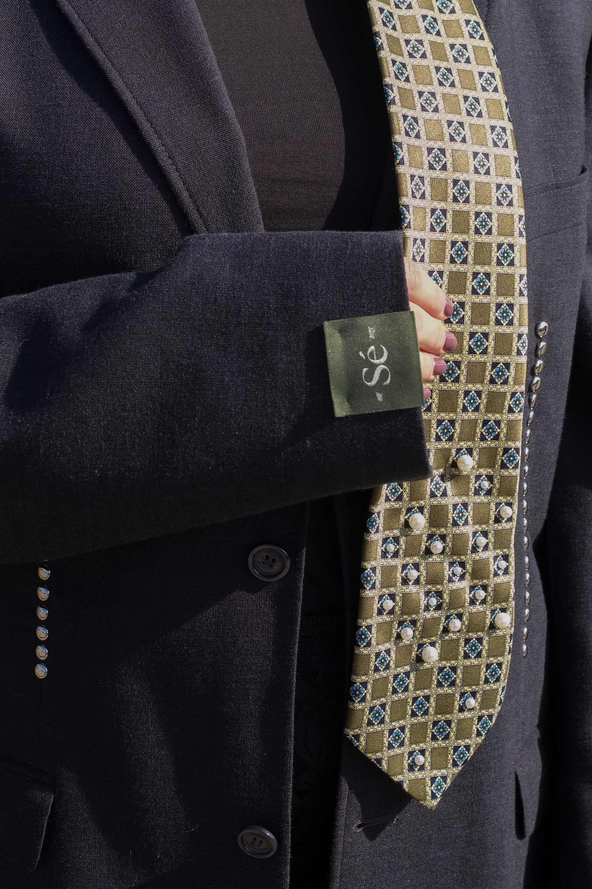 Vintage patterned tie featuring a gold base with blue and white geometric detailing. Accented with hand-applied pearl and crystal embellishments, this statement piece adds a refined yet playful touch to any look.